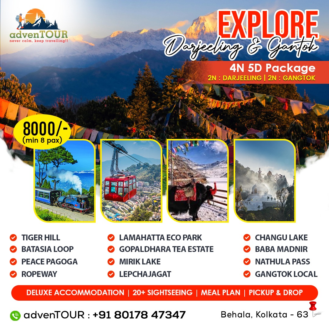 Destinations Covered: Tiger Hill, Batasia Loop, Peace Pagoda, Ropeway, Lamahatta Eco Park, Gopaldhara Tea Estate, Mirik Lake, Lepchajagat, Changu Lake, Baba Mandir, Nathula Pass (optional), Gangtok local sightseeing.